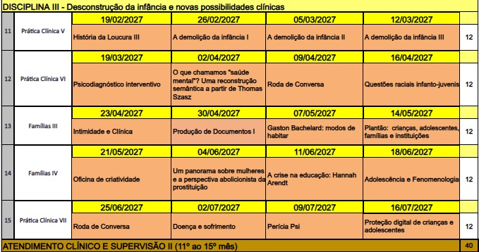 Conceitos fundamentais e genealogia da Fenomenologia; Estratégias Discursivas Clínicas aplicadas às crianças e adultos; Questões Práticas da Clínica, nomeadamente segurança digital, finanças, normas e leis; Patriarcado como fundamento da Psicologia; Fundamentos do Feminismo; Feminismo e Fenomenologia; Mediação Familiar; Crítica à psicopatologia; Teorias de Poder; Filosofia Política; Conceitos de Retórica e de Argumentação.
