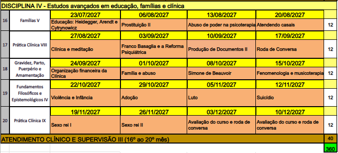 20 meses, total de 360 horas divididas em aulas e supervisão de situações clínicas e institucionais.. ,rr