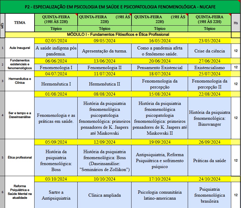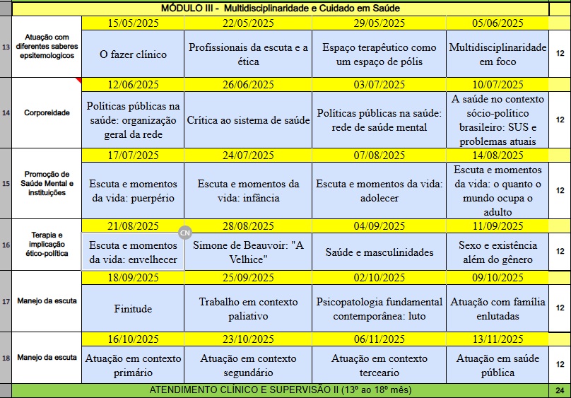 As aulas teóricas online (ao vivo) ocorrerão às quintas-feiras de 19h às 22h, conforme calendário acima e ficarão gravadas e disponíveis para os pós-graduandos por pelo menos dois anos após o encerramento da turma. O horário de supervisão de práticas clínicas será informado em breve. Tanto as aulas teóricas quanto a supervisão de práticas clínicas serão realizadas na modalidade online de forma síncrona, ou seja, aulas ao vivo.